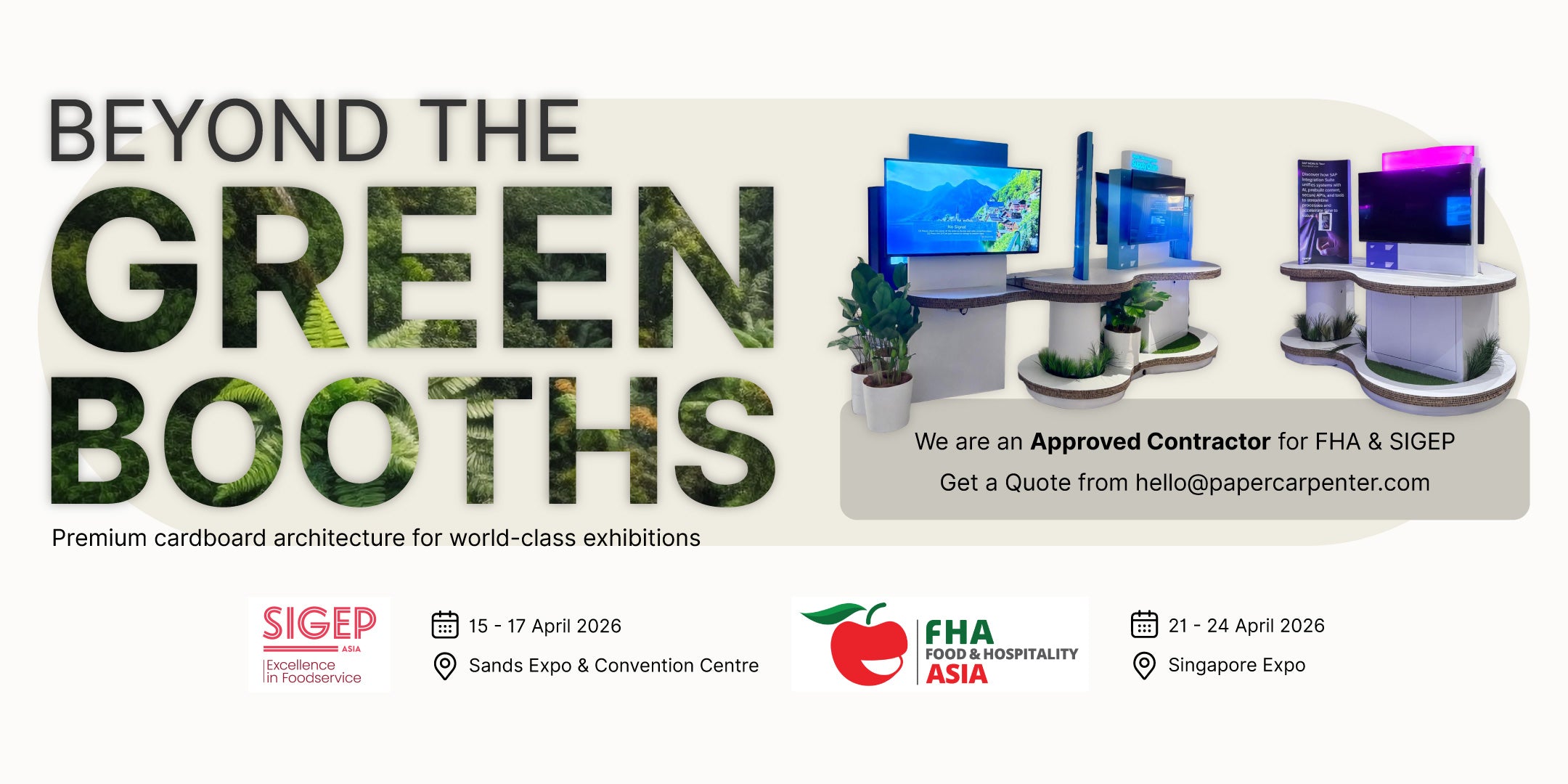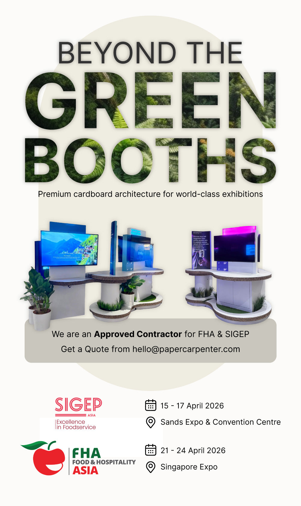 To help us understand your design needs, kindly provide us with a brief description of your event, some reference photos of your booth concept, booth size and details such as date and location. We will be happy to schedule a consultation on how we can help you design a sustainable booth design using our eco-friendly materials.